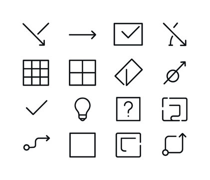 Mirror Puzzle Icons. Mirror-based puzzles. Line icon set of Mirror-based puzzles: angled mirror, beam direction, reflection rule, position grid, puzzle square,