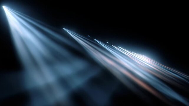 Abstract glowing blue light beams and streaks with shine and reflection on dark background.