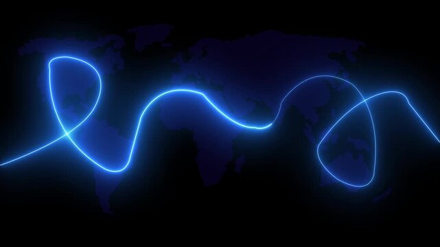 Global business growth neon glowing line and world map background animation 4k. Business, economy, financial services Abstract concept.Seamless loop animation glowing neon lines streaming across.