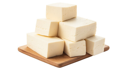 Blocks of fresh white firm tofu on a wooden cutting board with Transparent Background, PNG
