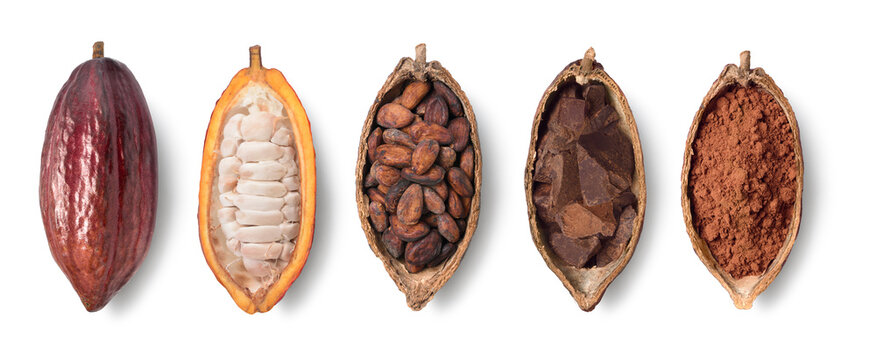 Top view of fresh cocoa fruit, fresh and dried cocoa beans  isolated on white background. Clipping path.