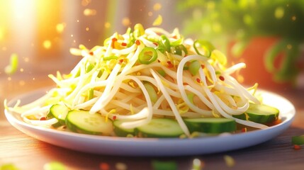 A bright pile of mung bean sprouts with white roots and green tips, perfect for salads, stir-fries, or sandwiches. Fresh, crunchy, and full of nutrition for a healthy, versatile menu.