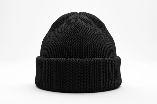 A blank black beanie hat is showcased against a pristine white background for design mockup purposes.