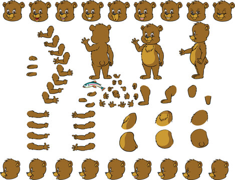 Brown bear creation set. Various gestures, emotions, diverse poses, views. Create your own pose, animation. Flat style vector illustration