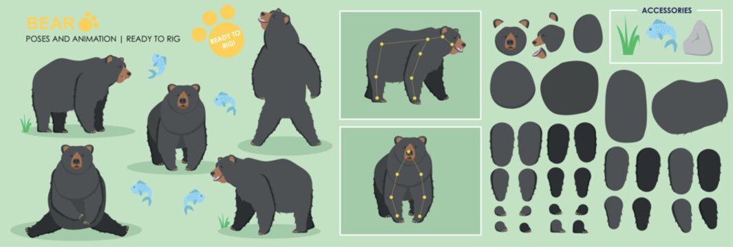 Cute black bear ready for animation rigging , multiple poses, collection multiple angles including accessories, cartoon teddy bear character vector pack.