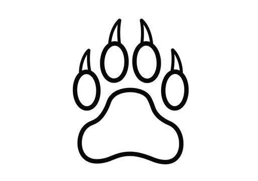 Bear paw drawing. It is a black and white outline image of a bear's paw with claws, representing the animal's powerful presence. Vector sketch line art draw.