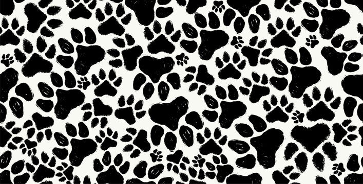 Paw pet seamless pattern. Endless dog or cat foot print texture, animal background. Grunge stamp repeat, foot track wallpaper. Cartoon vector illustration. Vector paw pet dog and cat seamless pattern.