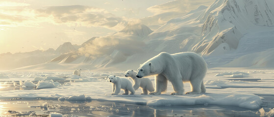 A family of polar bears navigating icy terrain in the Arctic wildlife phtography