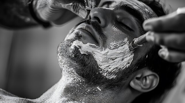 Close up of a handsome man getting his beard shaved in a hairdresser professional hairdresser using a razor shaving his customer profession.