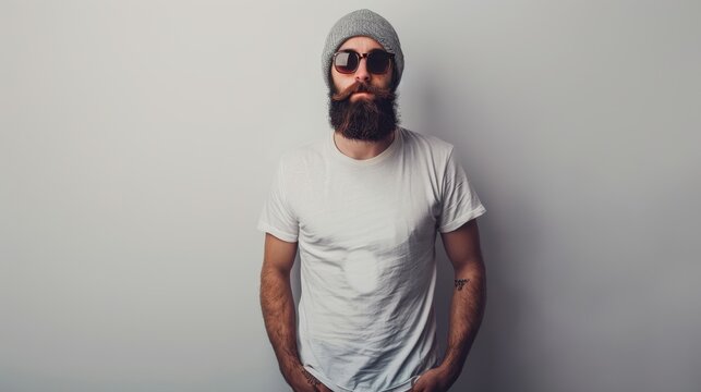 A stylish man, with his long hair cascading down his back and a full beard framing his face, confidently dons a pair of sleek sunglasses, exuding an air of mystery and intrigue