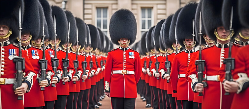 Close up of soldiers marching at the Trooping the Colour military parade at Horse Guards, London UK. Guards are wearing iconic black and red uniform and bearskin hats.