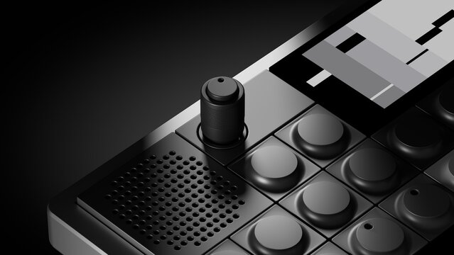 Close up of a sleek black synthesizer with round buttons, a textured knob, and an abstract graphic display, emphasizing music production and sound design