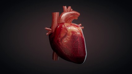 realistic 3D rendering of a human heart beating rhythmically with a moving colorful spectrum background creating a dynamic medical visualization