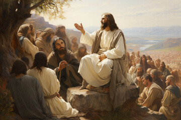 Jesus delivering the Sermon on the Mount, conveying His teachings and the Beatitudes to the crowd Generative AI