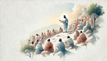 Jesus on a mountain, delivering the Beatitudes to a crowd below. The watercolor uses soft pastel blues and yellows to evoke calmness, divine teachings, and hope.