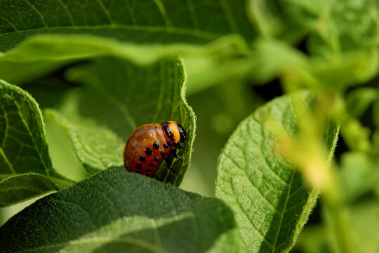 Colorado potato beatle Leptinotarsa decemlineata beetles and larvas on potato leaves