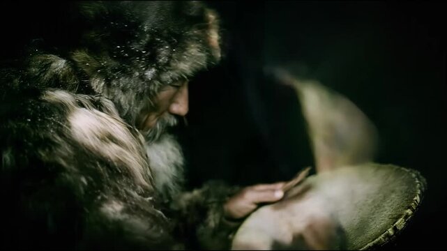 Shaman beats a drum at night in a mystical forest, invoking ancient spirits with rhythmic sounds under the moonlight, capturing a powerful tribal ritual.