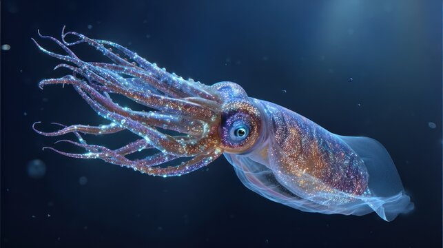 A captivating underwater view of a bioluminescent squid, showcasing intricate details and sparkling colors against a dark blue ocean backdrop.
