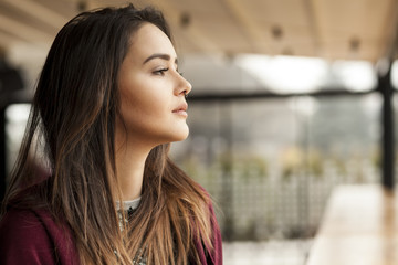 Beautiful white girl with red lips looks to the camera. Stunning brunette girl. Closeup face of young beautiful woman with a healthy clean skin. Pretty woman with bright  makeup of eyes.