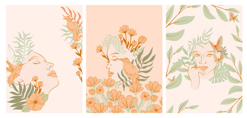 Collection of posters with beautiful Woman face portrait with plants and flowers in one line style. Blooming abstract Women. Minimalistic style. Vector illustration.