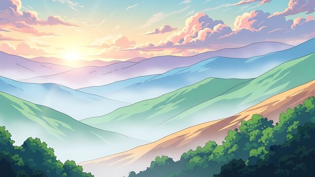 Vibrant sunrise over a serene mountain range with pastel skies and misty valleys