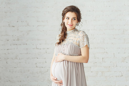 Smiling pregnant woman sitting on sofa and caressing her naked belly, waiting for meeting with her baby