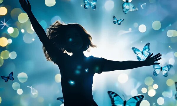 Woman, joy, butterflies, light, freedom, bokeh, hope, spiritual, peace, background, well-being, stock photo