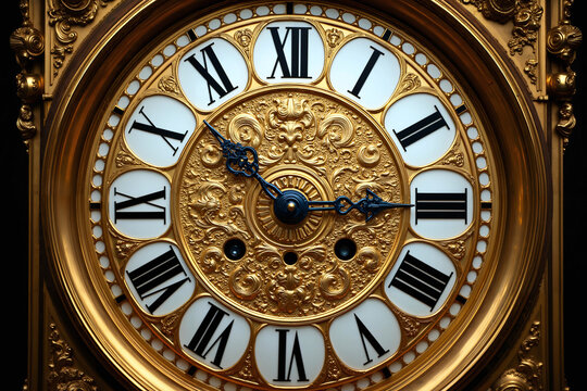 A vintage decorative clock face with gilded gold surface, adorned with intricate handcrafted design and floral motif. A royal timepiece with roman numerals, opulent, from European Renaissance times.