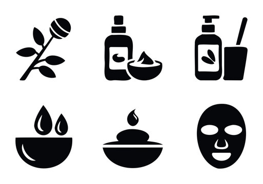 Set of cosmetic and spa icons representing skincare products, rose branch, liquid drops, and face mask for beauty and wellness applications