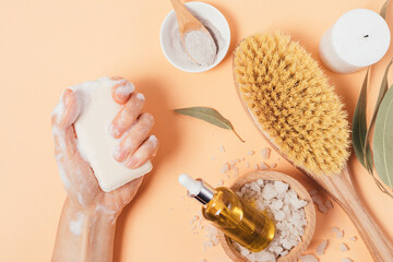 Soap in spa bathroom: This image shows a bar of soap placed in spa bathroom surrounded by bubbles, creating a feeling of a relaxing and luxurious self-care routine.