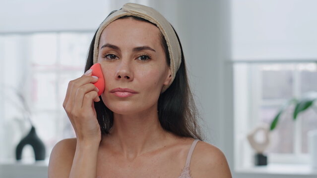 Pov morning lady makeup routine at bathroom. Woman holding visage beauty blender