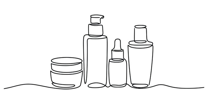 Minimalist continuous line art drawing of a set of beauty and skincare product containers