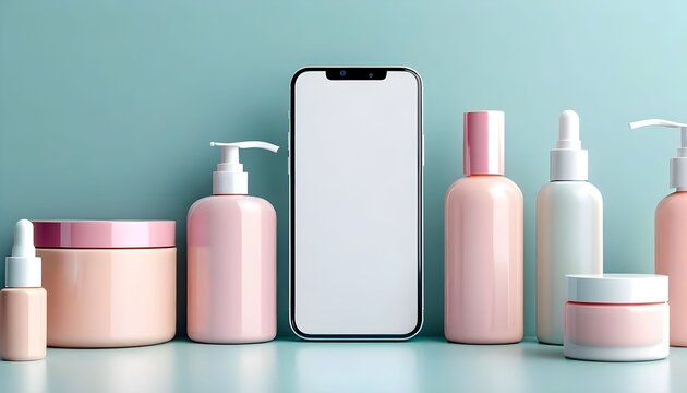 A smartphone sits in front of beauty products, showcasing cosmetic packaging.