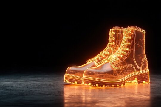 safety, security and certification concept Illuminated stylish boots on a dark surface