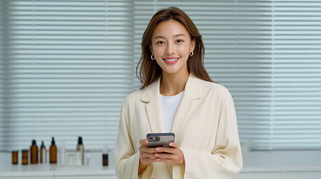 A young Asian woman records a live beauty vlog in a bright, softly lit room, standing behind a clean white table scattered with various skincare bottles and cosmetic containers. He