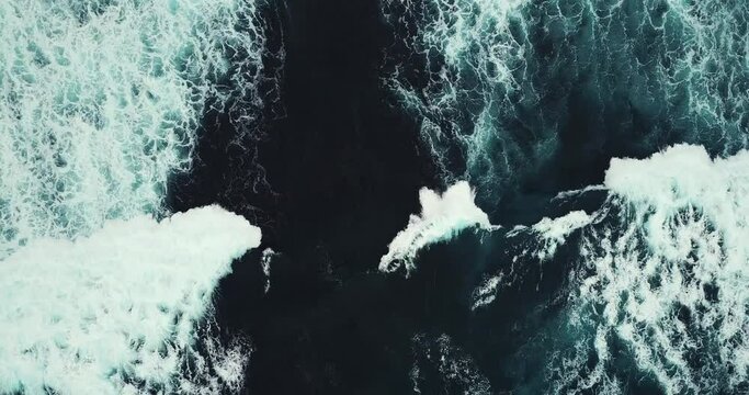 Slow motion from above onto frothy mesmerizing lapping waves of sea on gloomy summer day. Idea of beauty nature and power elements.