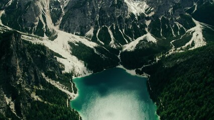 A lake with bright blue water between rocky mountains with snow-capped peaks and spruce-covered slopes, a bird's-eye view from a drone