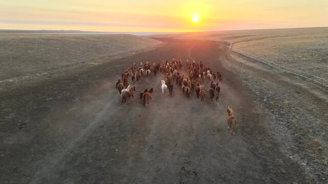 Majestic mustangs run wild at sunset across a dusty field in this aerial drone view of nature's beauty