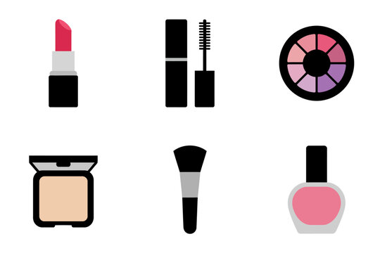 Minimalist makeup icon set, lipstick tube mascara wand powder blush compact brush eyeshadow palette nail varnish bottle, modern beauty graphics