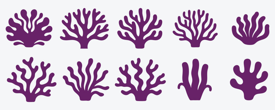 Set of ten distinct purple coral shapes showcasing the beauty and variety of ocean flora for aquatic themed graphics