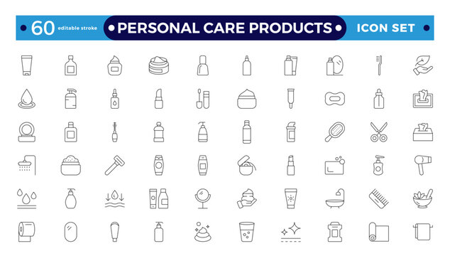 Cosmetics icon set. Contains such icons as  product, care, skincare, makeup and more. Minimal icons pack. Skincare icon. Editable vector stroke.