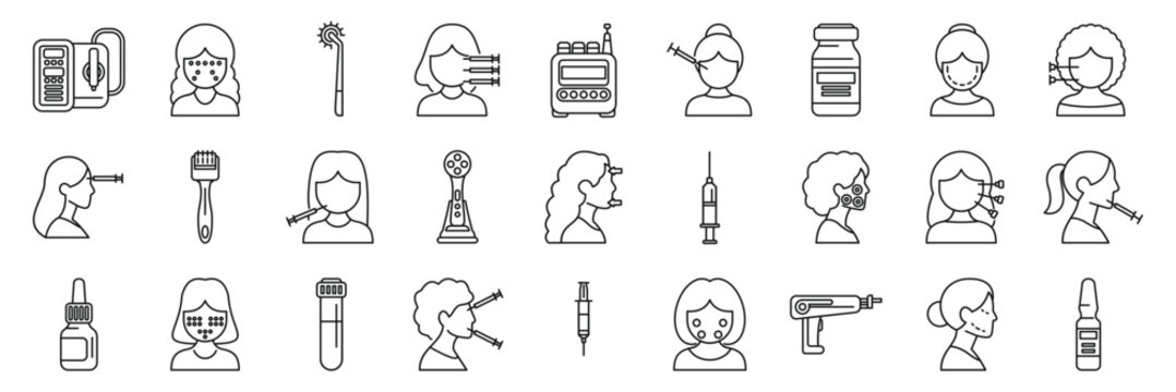 Plastic surgery black line icons set. Rhinoplasty, otoplasty, eye lift, buttock lift. Anti aging injection, therapy. Signs for web page, mobile app, banner, social media. Editable stroke.