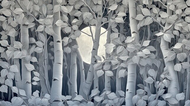 Moonlit forest scene trees and foliage silhouette against a glowing orb