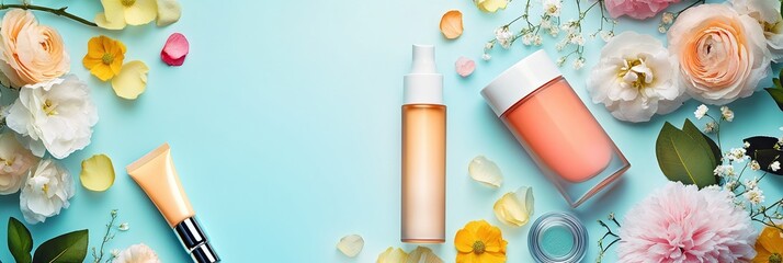 Graphic design layout showcasing beauty products surrounded by colorful flowers