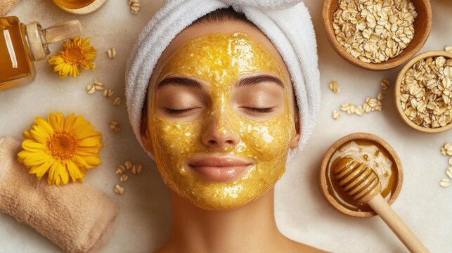 A woman with a facial exfoliating scrub on her face, eyes closed and hands cupping her cheeks.