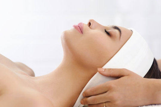 Cosmetologist cleaning face skin of young blond woman with cotton pad, preparing for injection treatment in beauty parlor