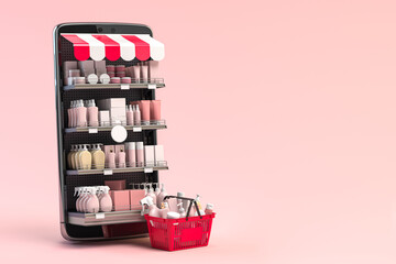 Cosmetics and beauty products buying online concept. Shopping basket with makeup products and mobile phone as shelf full of cosmetics on pink background.