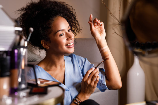 Smiling woman applies makeup, radiates elegance and self-care