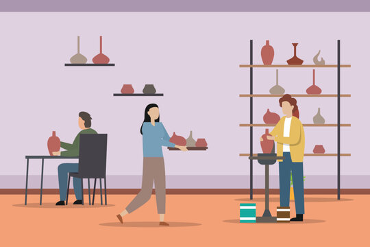 Pottery hobby. Handcrafted earthenware, people decorating pots and handicraft pottery workshop 2d vector illustration concept for banner, website, landing page, flyer, etc