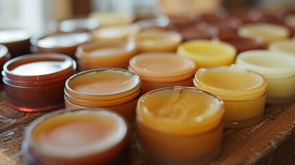 A close-up view of a collection of handcrafted beeswax lip balms, their golden hues reflecting the warm light of a cozy workshop